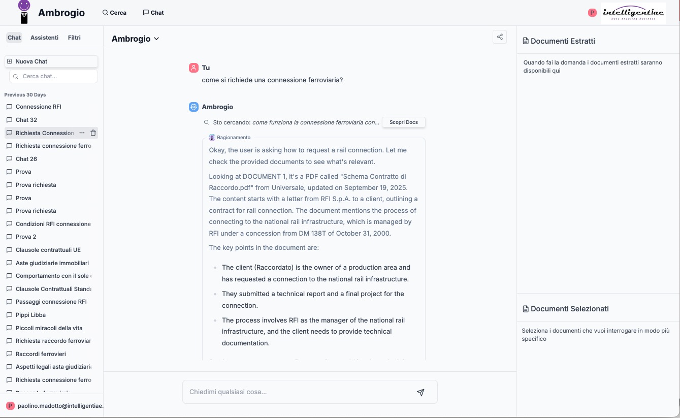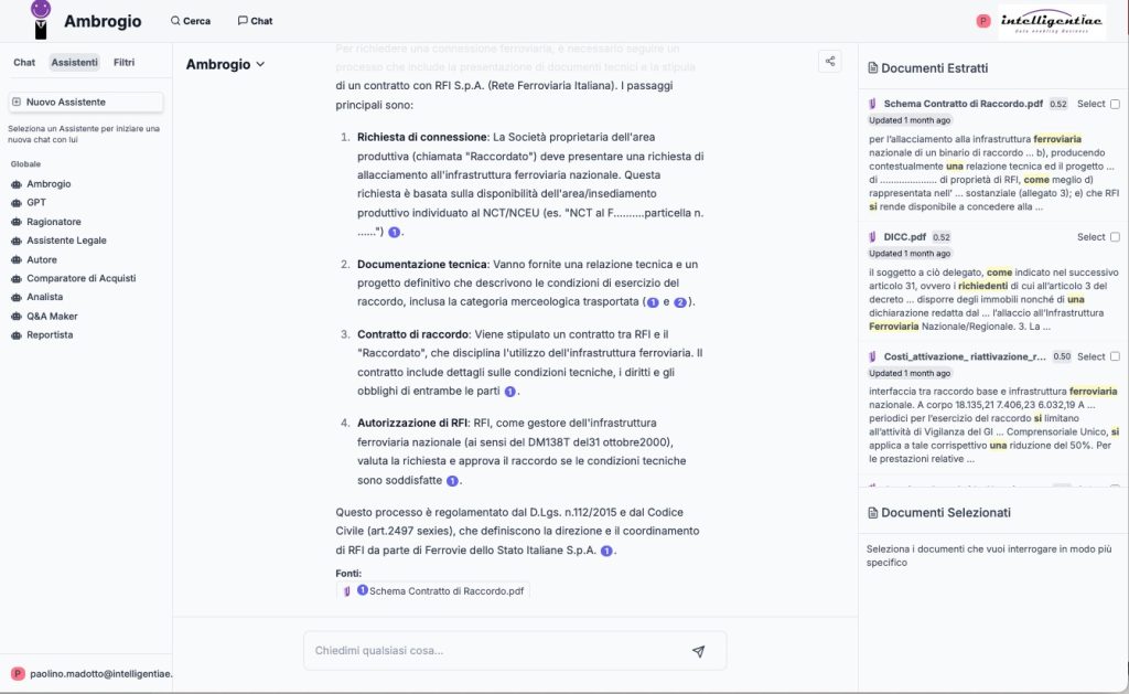 AMBROGIO consente di ricercare informazioni e i relativi documenti e sessioni di domande e risposte ed è possibile anche decidere di interrogare solo alcuni documenti e conservare le sessioni. È anche possibile creare degli “Assistenti” che hanno caratteristiche di ricerca che meglio rispondono ad usi particolari, sia in termini di set di documenti dove cercare sia in termini di caratteristiche delle risposte.