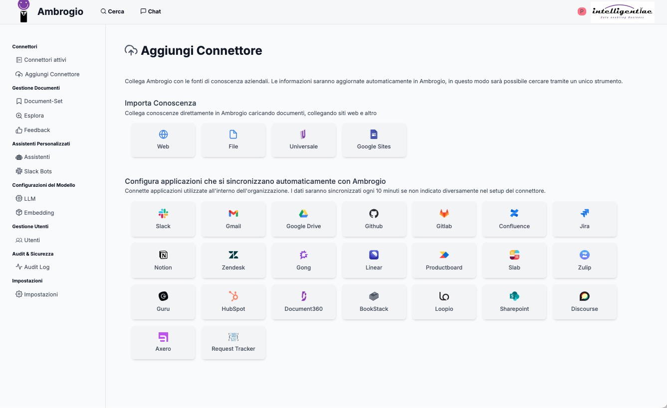 Questi connettori si aggiornano periodicamente mediante la sincronizzazione con le rispettive fonti informative, garantendo così l’attualizzazione e l’ampliamento della conoscenza a disposizione degli utenti di Ambrogio. Immaginate la possibilità di porre una domanda e ricevere una risposta precisa generata attingendo a tutte le informazioni correlate disponibili all’interno dell’azienda – questa prospettiva risulta decisamente stimolante.