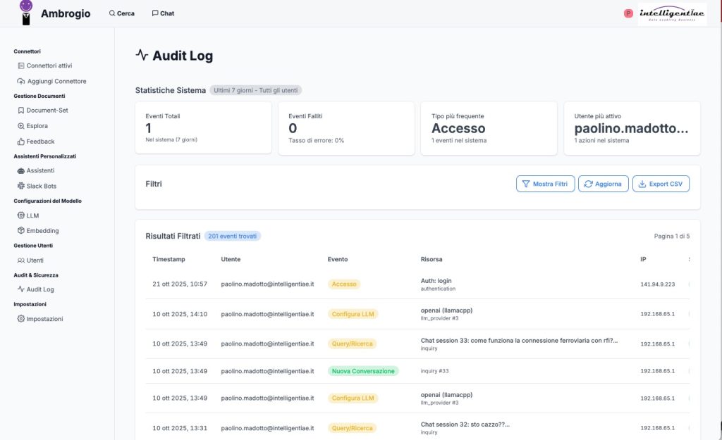 Ambrogio è dotato anche di numerose funzionalità tra le quali l’audit-log per essere pienamente compliance con GDPR, NIS2, ISO27000. Ogni operazione di ogni utente è tracciata e rilevata.